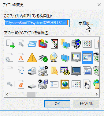アイコンの変更ダイアログが開くので、「参照」ボタンを押して 使いたいアプリの実行ファイルなど、適宜アイコンの表示されているファイルを指定する。(勿論下の一覧から選択するのが簡単だが、アプリに適したアイコンがあることは稀だ)