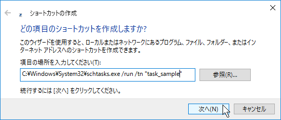 「項目の場所を入力」という欄に C:\Windows\System32\schtasks.exe /run /tn "task_sample"