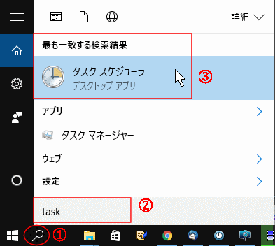 タスクバーの虫眼鏡アイコン①(「WebとWindowsを検索」)をクリックして開く検索欄②に「task」と入力すると「最も一致する検索結果」③の欄に「タスクスケジューラ」が表示されるのでそこをクリックしてタスクスケジューラを起動する。
