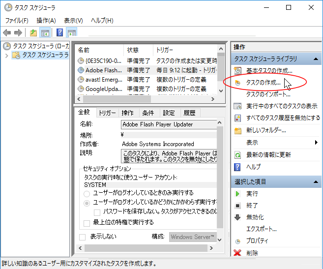 タスクスケジューラが起動したら右側の「操作」ペインから「タスクの作成」をクリックする。(注:「基本タスクの作成」ではない)