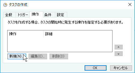 「操作」タブを開く。タスクの新規作成の場合、「操作」リストはまだ空欄なので「新規」ボタンをクリック。