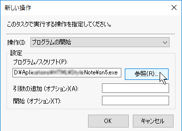 「操作」の種類が「プログラムの開始」になっていることを確かめ、「参照」ボタンをクリックして起動するアプリ(UACが表示されるアプリ)の実行ファイルを指定して「OK」ボタンを押す。