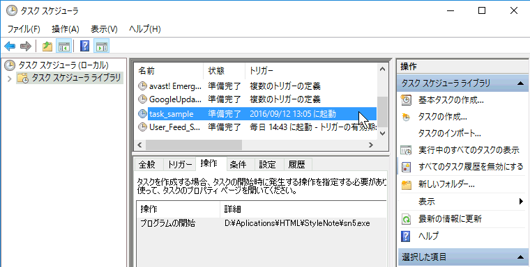 タスクスケジューラに戻るので、タスクスケジューラライブラリに作成したタスクの名前があることを確認する。