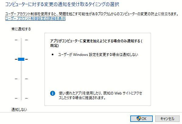 【1】 比較的多く紹介されている方法は、コントロールパネルなどから「ユーザーアカウント制御設定の変更」を選んで、セキュリティレベルを下げる(「通知しない」に設定する)方法。