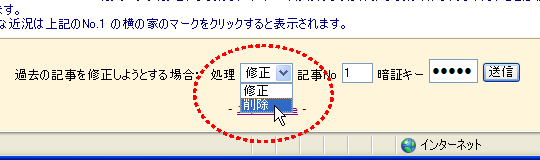 を押して、「削除」を選びます。記事Noと暗証キーは同じです。
