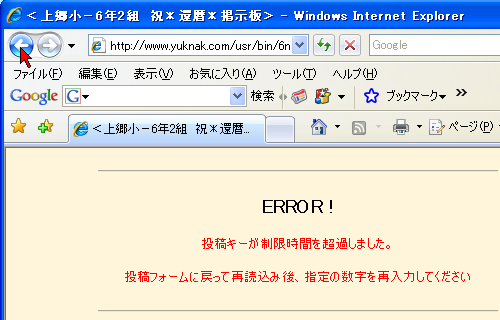 もし次のエラーが出たら、慌てないで左上のIの「戻る」ボタンを押して、元の画面に戻り、記入漏れや間違いを確かめて記入・修正して再度「投稿する」ボタンを押します。