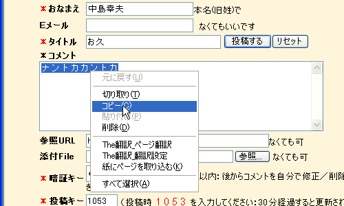 と、再度入力しないといけないのでコメントの部分をドラッグして選択し(マウスの左ボタンを押したまま、文字の上を囲むようになぞります。)、文字の周りがブルーになったままでマウスの右ボタンを押します。「コピー」というメニューが表示されますので、ここをクリックします。(見えませんが、これでコメントのブルーに選択した部分がコピーされました。)