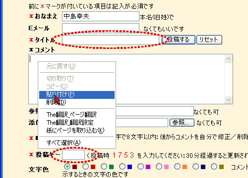 タイトルをもう一度記入して、コメントの欄の中でマウスの右ボタンをクリックします。メニューが表示されるので「貼り付け」を選択します。