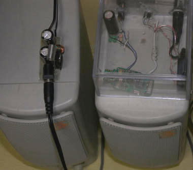 更に続けて。 一つ問題が発覚した。Bluetooth受信機が Music Playerから音楽を受信している時は問題ないんだが、それを切るとハムノイズがかなり出る。これではスリープタイマーで Music Playerがスリープした途端、ハムノイズで目が覚めてしまう。思い当たるのは、改造前はイヤホン直結の受信機だったから、そのイヤホンのインピーダンスと代わりにつないだスピーカーアンプの入力インピーダンスの違い。アプリから信号を受信している時は、受信機のアンプ出力が低インピーダンスになっているのでハムは乗らないが、親機のアプリがOFFして受信機の出力を切った場合、何せ小さなガムほどの充電池だから省電力化のために出力段をOFFして高インピーダンスにしているとすると、その後段のスピーカーアンプ入力にハムノイズが乗っても不思議はない。  という推測で、受信機出力にイヤホン相当の 22オームをつないだら大正解! 目立つノイズは消えた。しかし一旦気になりだすと、今まで気にしなかったノイズも気になりだした。まぁ PC用アクティブスピーカーだから、電源は小さな 9Vの ACアダプタで、ノイズ対策をしてあるとは思えない。ジャンクの中を探したら、CDラジオ用のかなり大振りなACアダプタが見つかった。但し、ラベルには 10Vと謳っているのに実測出力は開放で 16V近く出ている。どうやらレギュレータは内蔵されていない様子。このままだと、スピーカーアンプの耐圧が心配なので、9Vのレギュレータと 1000μFの電解コンを接続して使うことに。苦労の甲斐があってアンプのノイズは全く聞こえないレベルになった。(写真左が今回追加の電源回路。右は改造した Bluetooth受信機)