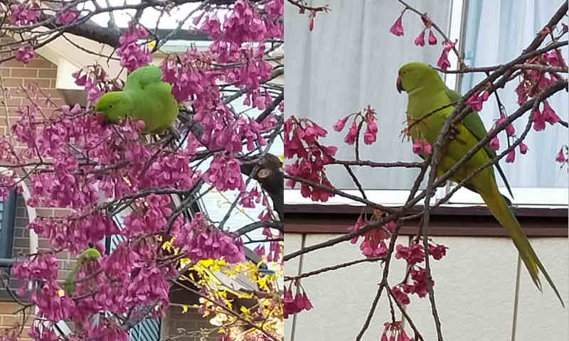 3日ほど前に近くの桜並木を散歩して、桜の花を食べに来るメジロなどの鳥を探していた時、何やら大きな鳥が花陰にいることに気づいた。 このあたりで桜を食べに来る大きめの鳥と言えばヒヨドリだが、花の隙間から見える色は全く違ってメジロに近いが大きさが全く違う。・・・と思って見ていると、もう一匹、更にもう一匹、何と3匹もいる。 驚かさないようにそっと回り込んでよく見える位置に移動したら、何とインコらしい。盛んに寒緋桜をついばんでいる。スマホのカメラでは撮影が難しいだろうと思いつつ構えても逃げる気配はなくて無心についばんでいるので何枚か撮影できた。 このあたりでインコは野生ではいないだろうから、どこかの家で飼っていたものが逃げ出したんだろうか? それにしても3匹一緒に逃げることは考えづらい。誰かが飼っていて、引っ越しなどの事情で飼えなくなって放したんだろうか? |