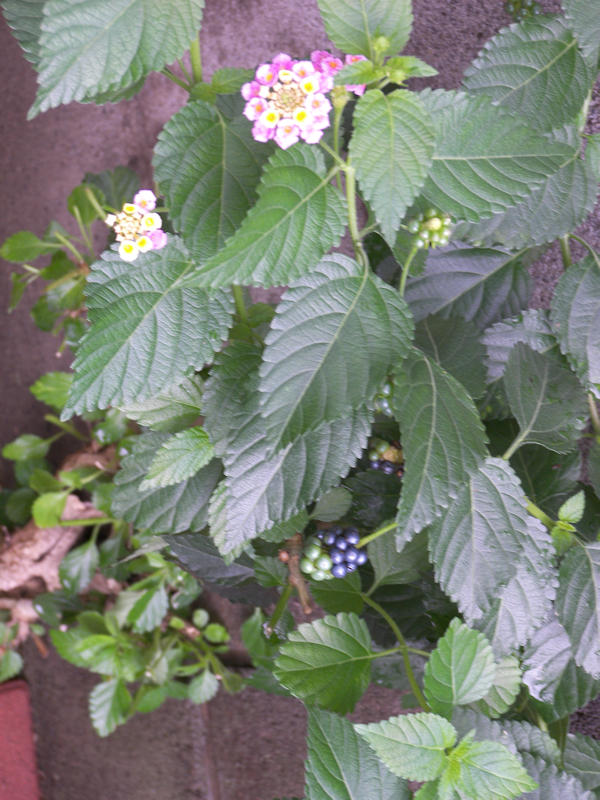 今日は中学校の同級生と飲み会予定だが、とりあえず写真は ランタナの花と実。葉の陰から色づき始めた実がのぞいていた。花色からするに、もっと鮮やかな色になるんだろう。