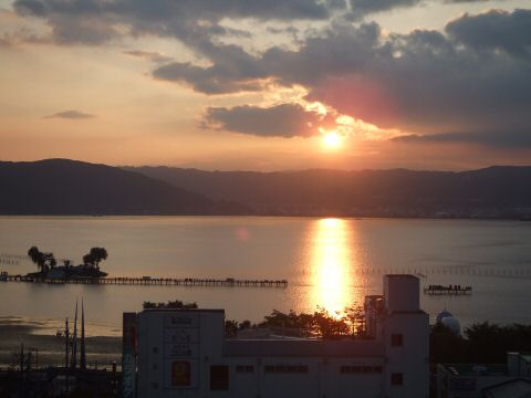 金曜日(1日)から、家族で諏訪方面に旅行しており、書き込みが出来なかったので、まとめて記入します。 我が家の女性は雨女が多く、移動するときは必ずと言っていいくらい雨が降る。さて出かけようと玄関に出ると、途端に降ってくることや、出迎えに行って電車がホームに入ってくる時に同時に雷雨を連れてくることも良くある。でも到着してしまうと、しばらくしてやむことも多い。 1日も例に漏れず朝から雨だったが、上諏訪に到着して蕎麦を食べて、あちこち歩いていると雨はやんだ。 旅館に到着して、早めに展望露天風呂に入ると、目の前いっぱいに雨上がりの澄んだ空気に夕焼けが広がっている。湖に夕焼けが映って絶景。昔、諏訪湖近くの展望レストランから夕焼けを見ながらお茶を飲んだことがあったが、この景色を見ながらの風呂は嬉しくなってしまった。しかも、他には誰もいなかったので独り占め。一人ではもったいないくらいの景色。 慌てて部屋に戻って、家族(全員女性)に薦めておいて、カメラを取ってきて記念撮影。 男湯でもさすがに他の人が入っていたらカメラを持って入浴するのは憚られるが、一人ならお咎めなし。高い階に風呂があるホテルも多いが、いくら景色が良くともガラス越しだとガラスが湯気で曇ったり露結したりで写真は難しい。ところがここは露天風呂なので、素通しに撮影できる最高のシチュエーションだった。 |