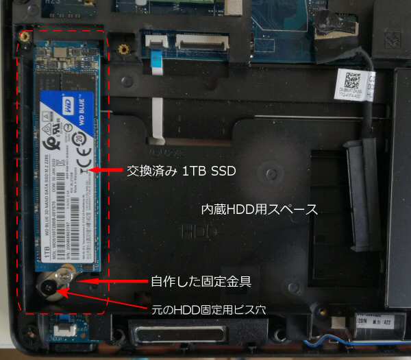 2FFR0 end bracket)が必要らしいという記述が。しかし当該PCは海外購入なので、国内 DELLサービスに同じ部品が在庫しているかは不明。在庫があったとしてネット注文しても 2-3日はかかる。せっかく底板を外したのにこのまま戻すのも悔しい。簡単には両面テープで固定する方法が考えられるが、経時的に安定して固定するのは難しい。そこで手持ちの金具を工面して加工して手作りすることに。 HDD固定用ビス穴が SSD固定用部分から 15mmほど離れたとことにあるんだが、道具箱を漁ると幸運なことに穴間隔が 2mmほど短いものの両端にネジを切った小さな金具が在庫にあった。これをミニヤスリで加工して穴間隔を広げ写真のように何とか m2-SSDを固定。