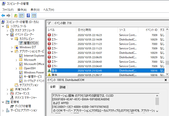 イベントエラーにエラーや警告が多数記録される