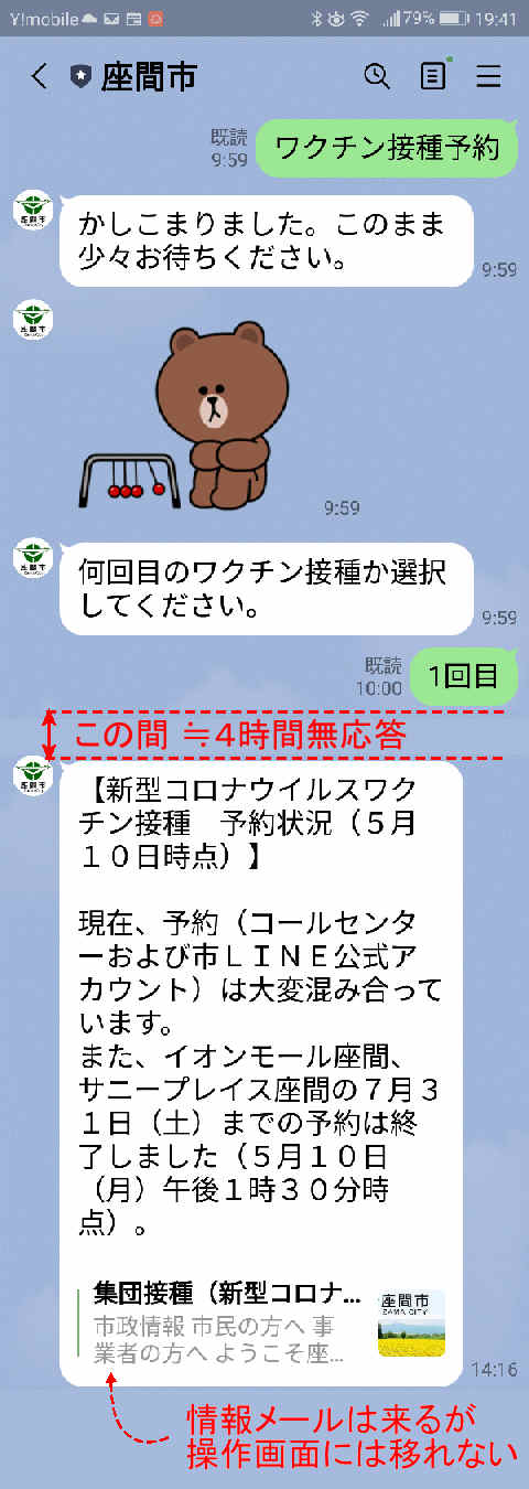 電話はどうせ繋がらないだろうと端から諦めていたので、朝10時きっかりに満を持して LINEのトーク画面に表示される申込みメニューから「ワクチン接種予約」ボタンを押して、「1回目」と選択したところで、次の入力画面に遷移せずそのまま応答がなくなった。夫婦でほぼ同時に操作したがどちらも同じ状況で、戻ることも進むこともできない。Webの操作方法の説明 PDFにもこうした場合の操作方法に関しては何も記載がない。仕方ないので繋がるはずのない予約ダイヤル(質問窓口も同じ)や市役所の代表番号や関連しそうな部署の個別番号いくつかに電話してみても、当然どれも話中で繋がらない。