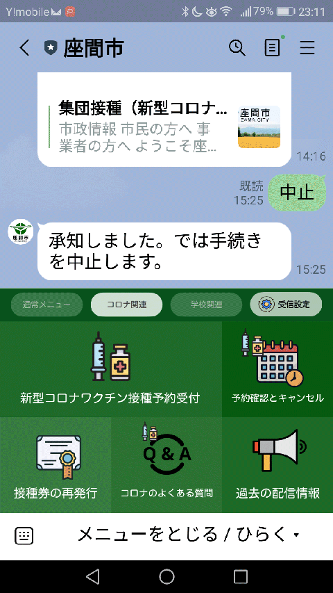 その後 LINEの画面には「すべての会場が予約満杯になりました」というメールが来たが、相変わらず申込みメニューは表示されないままだった。