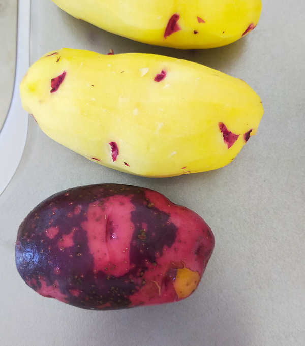 という話は置いておいて、先週末にオリンピック騒ぎの首都圏を逃れて岡谷に来たが(県境をまたいだ移動の自粛要請は、オリンピックで海外から何万人の人が来日するのに比べれば可愛いもの、コロナワクチン接種後 2週間経ったし、何より半年近くも可愛い盛りの孫たちとも会っていないのにこれ以上は無理・・・と無視して)、早速友人が採れたて野菜を持ってきてくれた。カボチャは今年最高のホクホクの砂カボチャ、トウモロコシも甘かったが、中にちょっとドキッとするようなものが。土を洗い落としたら写真のような赤と黒のまだら模様のジャガイモ。名前は見た目の通りのデストロイヤと言うらしいが、皮を剥くとメイクイーンと同じような黄色っぽい肉質でこれも驚き、料理方法はお勧めに従ってポテトサラダにしたが、滅法美味かった。