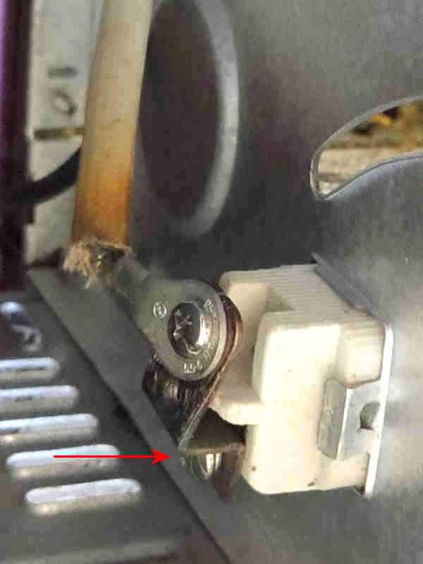 は完全に外れ商品だった。購入後 1年しないで通電しなくなって修理に出したが、その後も同様の不具合が発生した。すでに保証期間を過ぎていたので修理には出さず、自分で裏カバーを開けて見ると ACコードとヒーターの接続部分が黒く焼けていた(写真の耐熱絶縁チューブの色も熱で茶色く変色している)。ドライバーの先でつついてみると写真の赤い矢印の先のヒーターのソケット部分への中継金具の止めネジの締め付けが甘いようで「接触不良」っぽい。しかしその締め付けネジはケースの側板側を向いているので、ケース全体を剥がさないと締め直しできない。そのケースにはスイッチや ACコードなどが付いているのとケースと内部構造板が差し込みで組み立てられているので簡単には分解できそうにない。仕方ないので「コチョコチョ」と触ってから試しに通電してみたら通電できるようになったのでそのまま使い続けた。しかし当然数ヶ月でまた同じ症状が出るので同じことを数回繰り返して使い続けたところ、今回は何度「コチョコチョ」しても通電しなくなってしまった。どうやら焼けた金属表面が酸化しすぎて完全に導通不良になった様子。