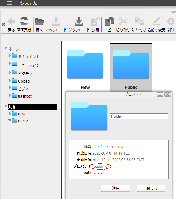 気づいたら、Navigator2のフォルダーのプロパティの属性が最初「readonly」だったのが「readwrite」に替わっていた(右図)。結局共有フォルダのアクセス制限を変更したことが功を奏したんだろうか。酷い紆余曲折だった。
