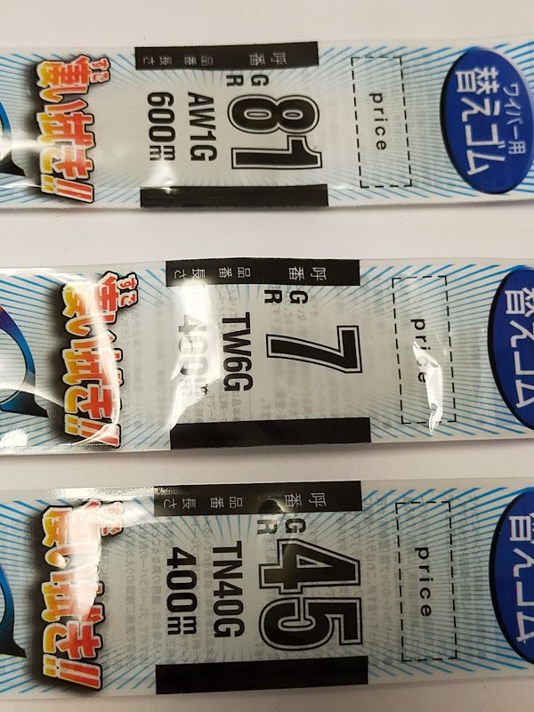 私の車はご主人と同様充分ご老体で もう20年選手に近いが、走行距離は 7万Km程度とエンジンや足回りはまだ壮年級。知人が次々「人生最後の車」と買い換えている中、ここで買い換えても今度はご主人の運転免許寿命の方が早く来そうなので、もう少し頑張ってもらうつもり。 普段乗ることも少なく雨天に乗ることはもっと稀だが、しかし最近ワイパーの拭き残しが気になっていた。交換しようかとも思ったが寒いのでついつい引き伸ばしていた。それが昨夜の雨が一転 今朝は薄日がさし始め気温も高めだったので、家人を駅に送った帰りに近くのカインズまで足を伸ばしてワイパーゴムを探してみた。一応 長さだけは 60Cmと 40Cm x 2と測って行ったんだが、売り場には同じ長さのいろいろな形式の交換用ワイパーゴムがあって、どれが対応品かも不明。ただ売り場をよく見ると商品の陰にメーカーの車種対応表が置いてあったのでそれを参考にチョイス。計 2700円ほど。こんなに高かったっけ? と思いつつも他に選択肢はない。もしかしたらアマゾンの方が安く買えたかな?とも思ったが、今日の天気は逃したくないので購入して帰ってきた。写真は 購入した NWBブランドのワイパーゴムで、上から純にフロントの運転席側用、助手席側用、リア用