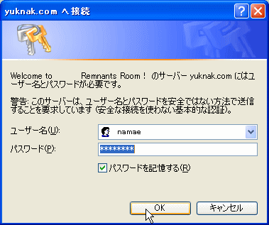 https://yuknak.com/usr/bin/upload*/list.cgi にアクセスすると、右のような画面がポップアップします。 自分のIDとパスワードを入力して、「OK」ボタンを押すと下のような画面になります。(表示されているファイル名は実際とは異なります)