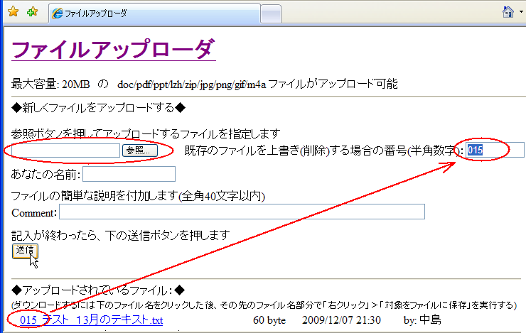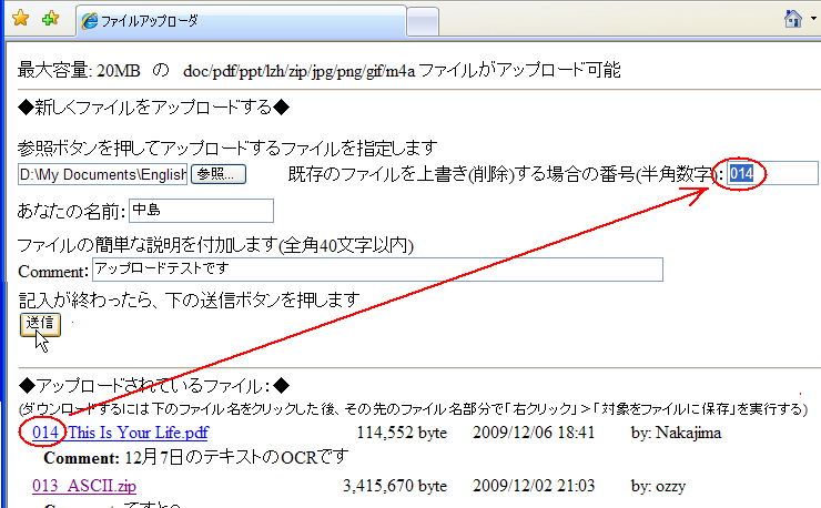 新しいファイルを上書きアップロードして、以前にアップロードしたファイルを消す場合は、下の図のように右の方の「既存のファイルを上書き(削除)する場合の番号」の右の欄に、上書きするファイルのファイル名の頭の数字(半角・3桁)を入力してから送信ボタンを押すと