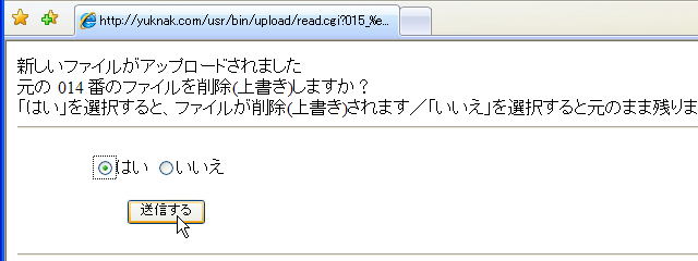上書きをするか確認する画面が表示されるので、「はい」にチェックをして「送信する」ボタンを押す。