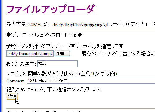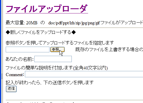置き換えでなく、アップしたファイルを削除する場合は、参照欄を空のままで削除するファイルの頭の数字を記入しただけで「送信」ボタンを押すと