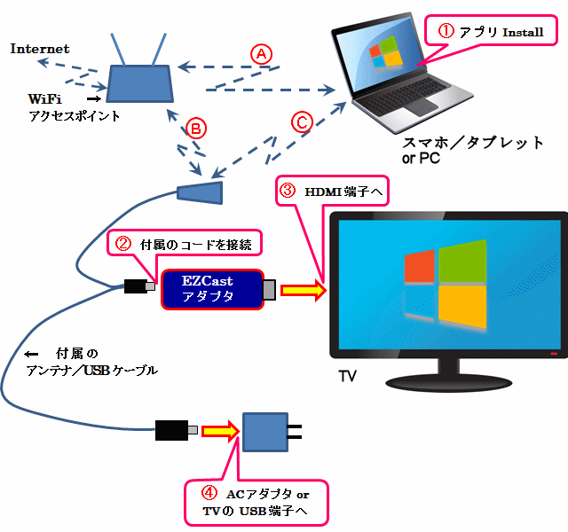 PC(or スマホ)と EZCastアダプタを WiFi接続する。