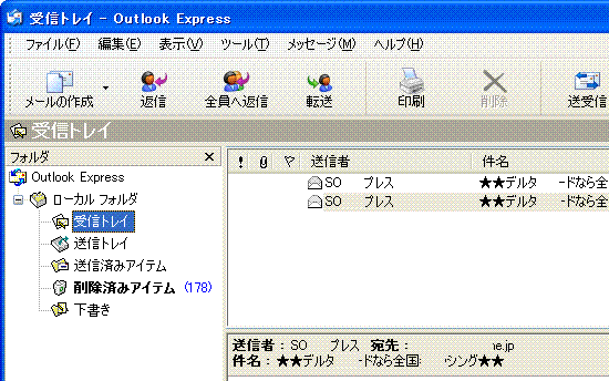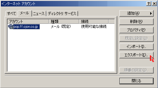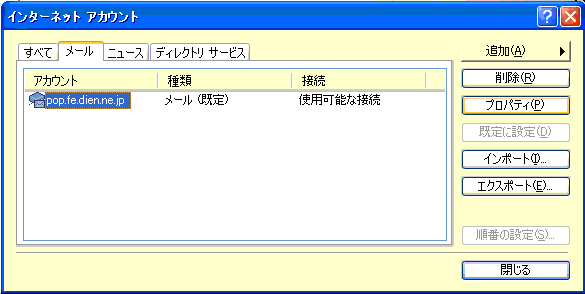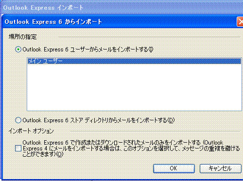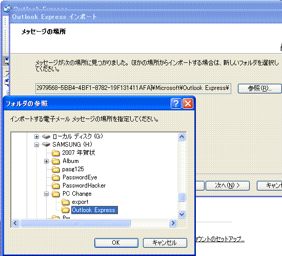 のような問い合わせがポップアップする。いつもメールを読むときにOE以外のアプリを使用しなければここで「はい」を選べば次回からは立ち上がらない。 (7) 新PCへのアカウント情報の設定 「インターネット接続ウィザード」ウィンドウが開いた場合は、「キャンセル」を押して一旦ウィザードを終了する。 上記 (4)で、アカウント情報のエクスポートを行った場合は、「ツール」 > 「アカウント」 で「インポートボタンを押して、表示されるファイルの指定画面で保存しておいた *.iaf ファイルを指定する。複数のアカウントを作成する場合は、該当する全てのファイルを指定してアカウントを作成する。 作成したアカウントの設定情報を確認するために 「プロパティ」ボタンを押してプロパティを表示させ、記録しておいた設定と間違いがないか確認する。 アカウント情報がエクスポートされていない場合は、追加ボタンを押して設定画面を開く。 「表示名」 は適当でいい、 複数のメールアドレスを使い分けている場合は「太郎/OCN」などとプロバイダまで分かるような名前にしておく。 入力したら「次へ」 を押す。 例に倣って、自分のメールアドレスを 入れる。 (5) で控えておいた 受信/送信サーバー名 を それぞれの欄に正確に入れる。 アカウント名も (5)で控えておいた アカウント名を入れる。 パスワードも 旧PCで読み取ったと同じモノを正確に入れる。ここで違うアカウント名やパスワードを入れると新しいPCではプロバイダのメールサーバーにつながらない。半角文字で大文字/小文字や「 . 」(ピリオド/ドット)と「 , 」(カンマ) や「 - 」(ハイフン)と「 _ 」(アンダーバー) 「 0 」(数字のゼロ)と「 o 」(アルファベットのオー) 「 1 」(数字の1)と「 l 」(アルファベットのエルの小文字)と「 I 」(アルファベットの大文字のアイ)などについては間違えやすいので特に注意して入力する。 毎回パスワードを入れる必要の無いように「パスワードを保存する」 もチェックが入っていた方がいい。(その場合は、アカウント毎のパスワードの控えを忘れないようにしておく) 「完了」 を 押して 「アカウントの追加」 は終了。 新しいメールアカウントが追加されたことを確認して、「閉じる」ボタンを押して終了する。 OEの初期画面に戻るが「送受信」 のようなボタンはここではまだ押さない。 (8) 新しいPCの Outlook Express に古いPCのメールをインポートする。 (2) で *.dbxファイルをコピーしたCD-Rや USBメモリーなどの記憶メディアを新しいPCに読み込めるようにしておいて、 「ファイル」メニューの 「インポート」から 「メッセージ」を開く。 インポートの画面が開くので、Microsoft Outlook Express の該当のバージョンを選ぶ。(古いPCの Express のバージョンを指定する) 「次へ」をクリックする。 場所の指定画面になるので、ユーザーを選ぶ。特に複数のアカウントを作ってなければ、「メインユーザー」を選択して 「OK」ボタンを押す。 メッセージの場所を指定する。「参照ボタン」を押す。 開いたフォルダの参照ウインドゥで、上記で .dpx ファイルをコピーしたフォルダを指定する。 個別にインポートしたければ「選択したフォルダ」を、全部インポートするのであれば「全てのフォルダ」にチェックを入れる。 「次へ」ボタン、 「完了」ボタンを押すとインポートが完了する。下記画面は、同じ .dbxファイルを指定してインポートしたために同じメールが2件表示されている。 (9) アドレス帳のインポート 「ファイル」 > 「インポート」 > 「アドレス帳」で、(6)でエクスポートしておいたアドレス帳をインポートする。 4.その他のファイルのコピー