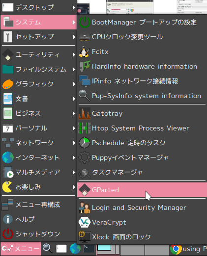 インストール用 USBを起動したら、別の USB端子にターゲット USBメモリを接続して、「メニュー」>「システム」>「GParted」を起動する。