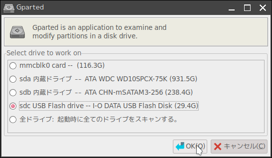 GPartedが起動すると、PCに接続されている HDD/SSD/SDカード/USBメモリなどの記憶媒体が一覧表示されるので、