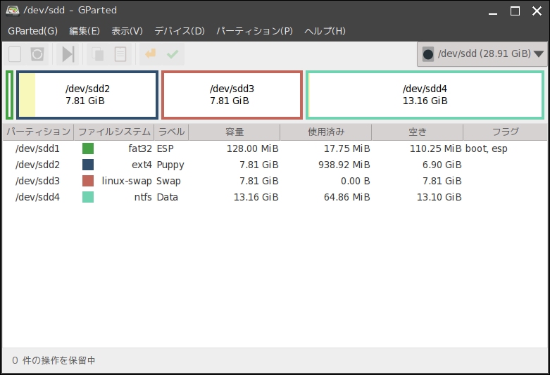 一例としては右図のとおり(32GBメモリ使用例)で、第1パーティションはデバイスの先頭領域の 100MB〜200MB程度、フォーマットはfat32で ESP/bootフラグを立てる。