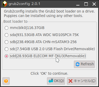 Puppy を Frugalインストールした直後に Grub2をインストールする場合は、赤線のように直前にインストールしたパーティションが