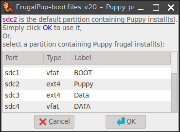 この作業を Puppyのインストールに続けて行わない場合(再インストールの場合など)は、右図のように (このUSBメモリで起動する)Puppy が含まれるパーティションを選択するように促されるので、ターゲットUSBの Puppyをインストールしたパーティションを選択して OKボタンをクリックする。