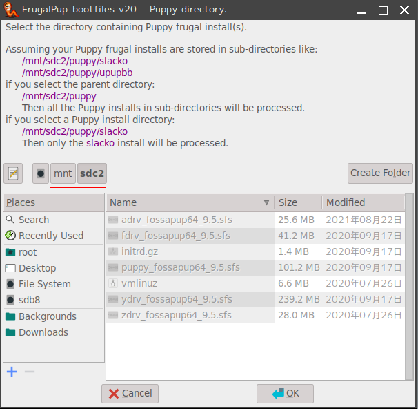 Puppy をインストールしたディレクトリを選択する。Frugal インストールしたとき、ディレクトリを作成せずにパーティション直下にインストールした場合は、図のようにパーティションが選択されているだけ(赤下線部分)で、ディレクトリは選択されていないのでそのまま OKボタンをクリックすればいい。