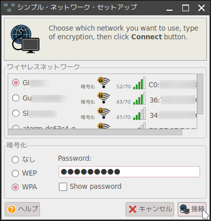 検出されたアクセスポイント一覧が表示されるので、必要なアクセスポイント名を選択して、パスキーを入力して「接続」ボタンを押す。