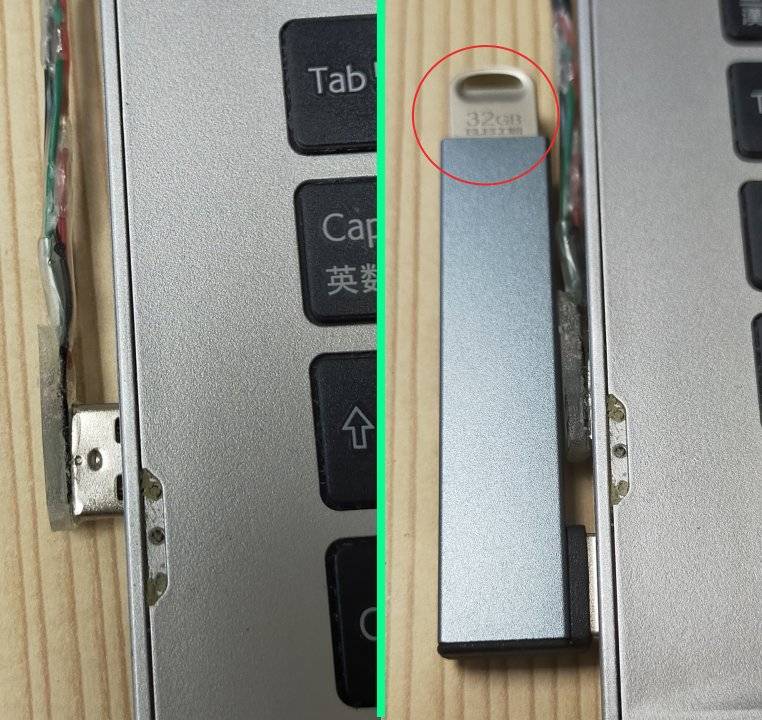 そこで 近くの DOSパラ店で見つけた USBメス同士のコネクタ(写真左上)を半分に切断したものに、10Pin コネクタをハンダで直接続し、エポキシ接着剤で補強して写真のような加工をし(写真 左下)、マザボの空き USB端子にこの USBコネクタを接続して(写真 右)ケース内部に隠れるようにしてある。